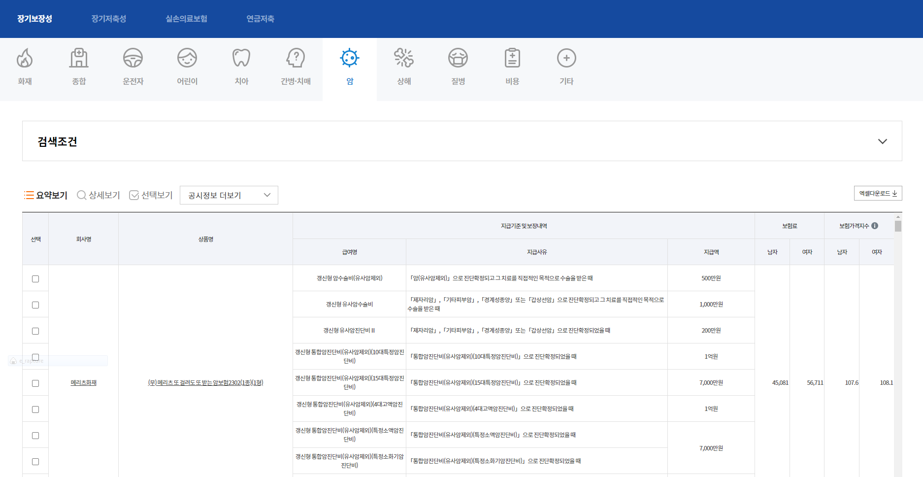 손해보험협회 홈페이지를 통해 다양한 보험별 상품비교공시표를 볼 수 있습니다. 실제 납부하게 되는 보험료와 보장내용은 소비자의 가입조건에 따라서 차이가 발생하기도 하지만 보험회사별 지급기준과 보장내역을 살펴볼 수 있어 편리합니다.