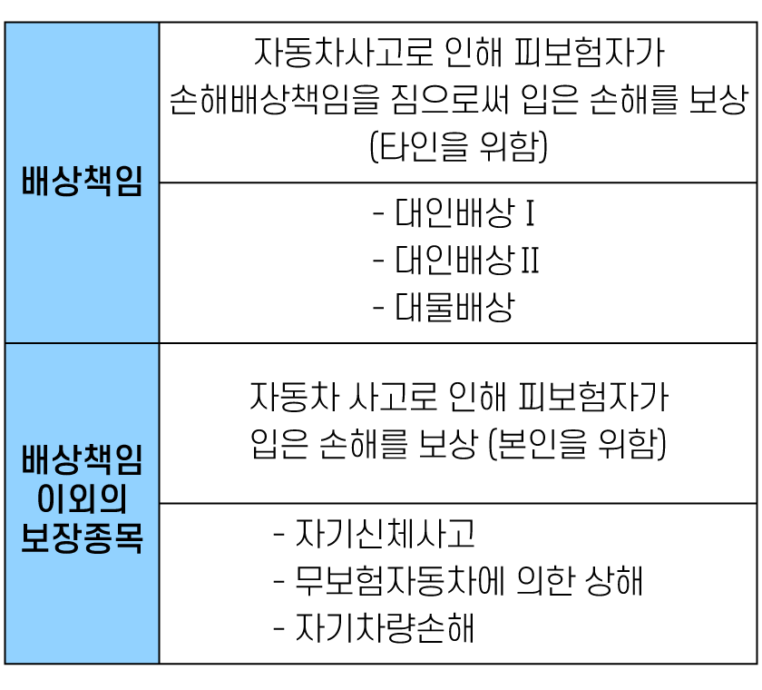 자동차보험은 자동차사고로 인해 타인에게 피해를 입힌 경우 이를 보상하는 배상책임과 자신(피보험자)의 피해를 보상하는 배상책임 외의 보장종목으로 나뉩니다.