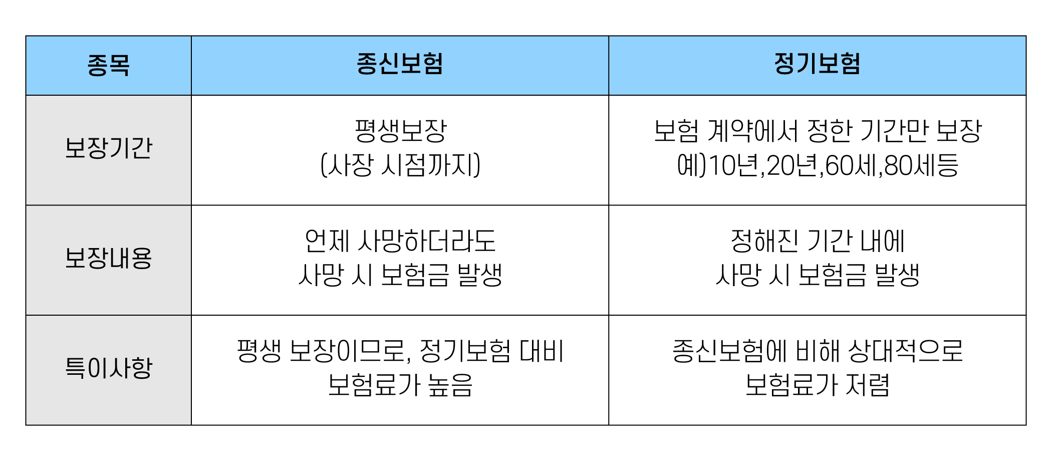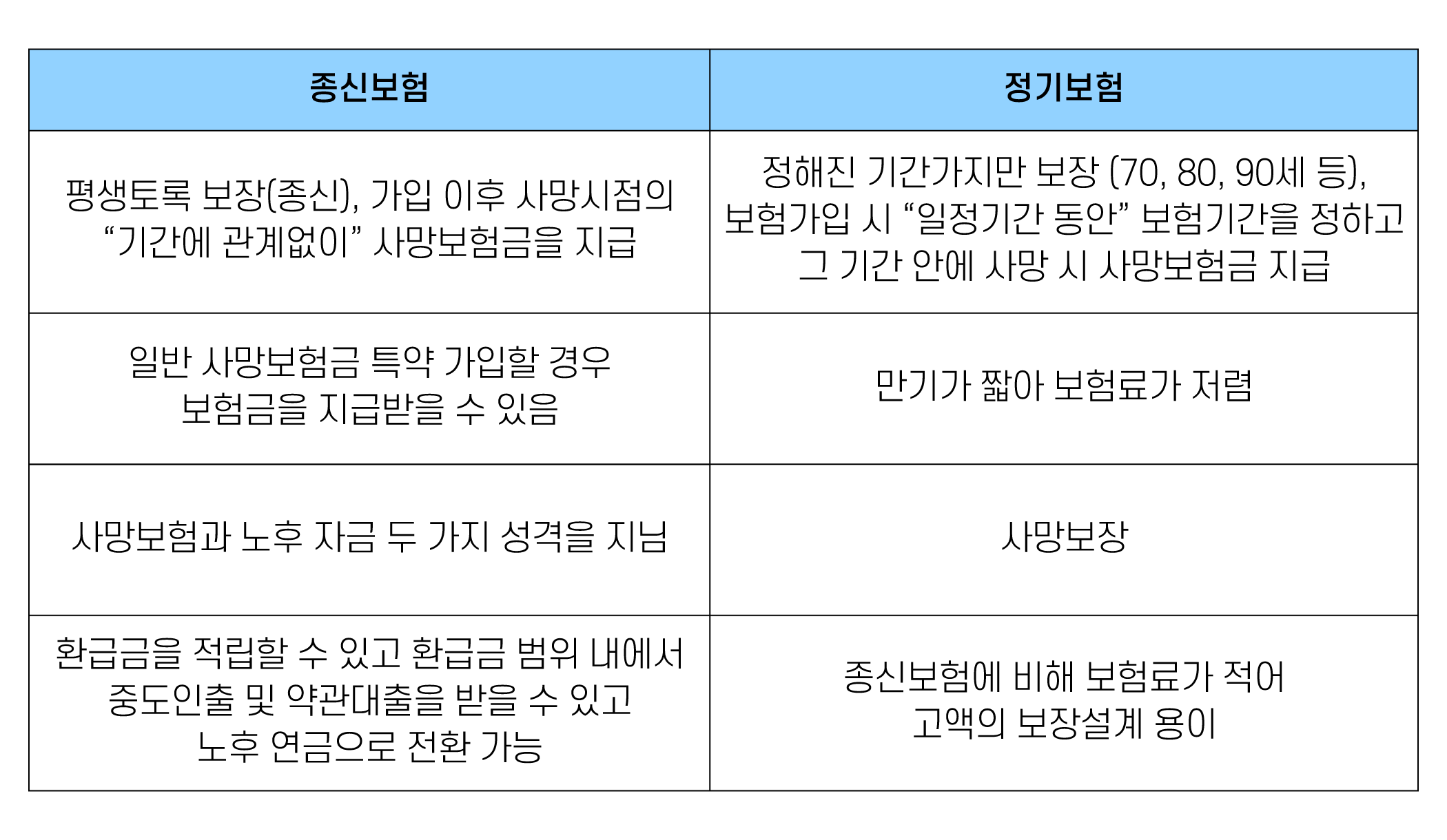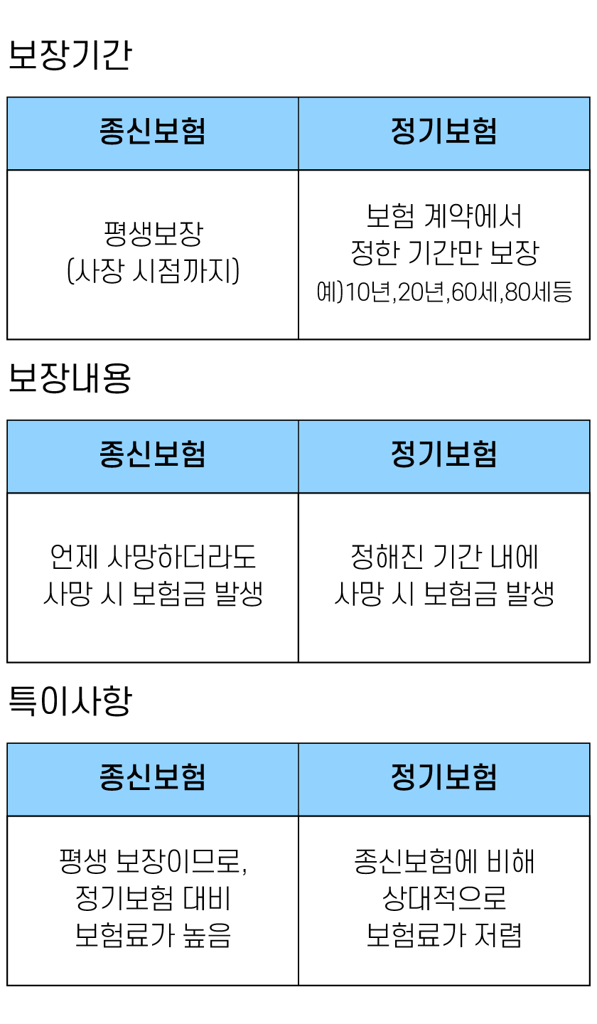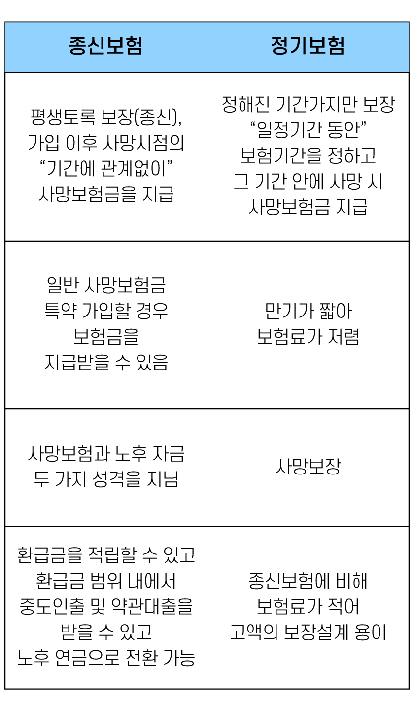 종신보험은 가입 후 평생 사망 보험금을 지급하고, 정기보험은 사전에 정한 기간까지만 사망 보험금을 지급하지만 저렴합니다.