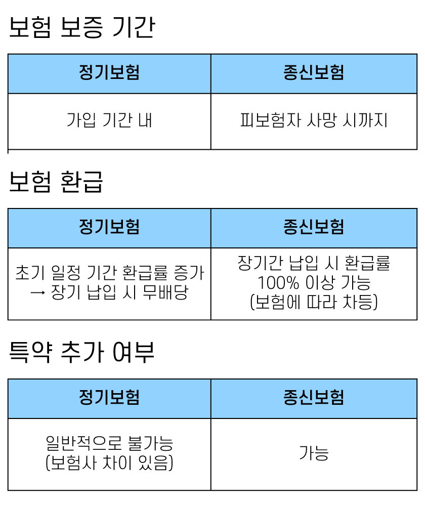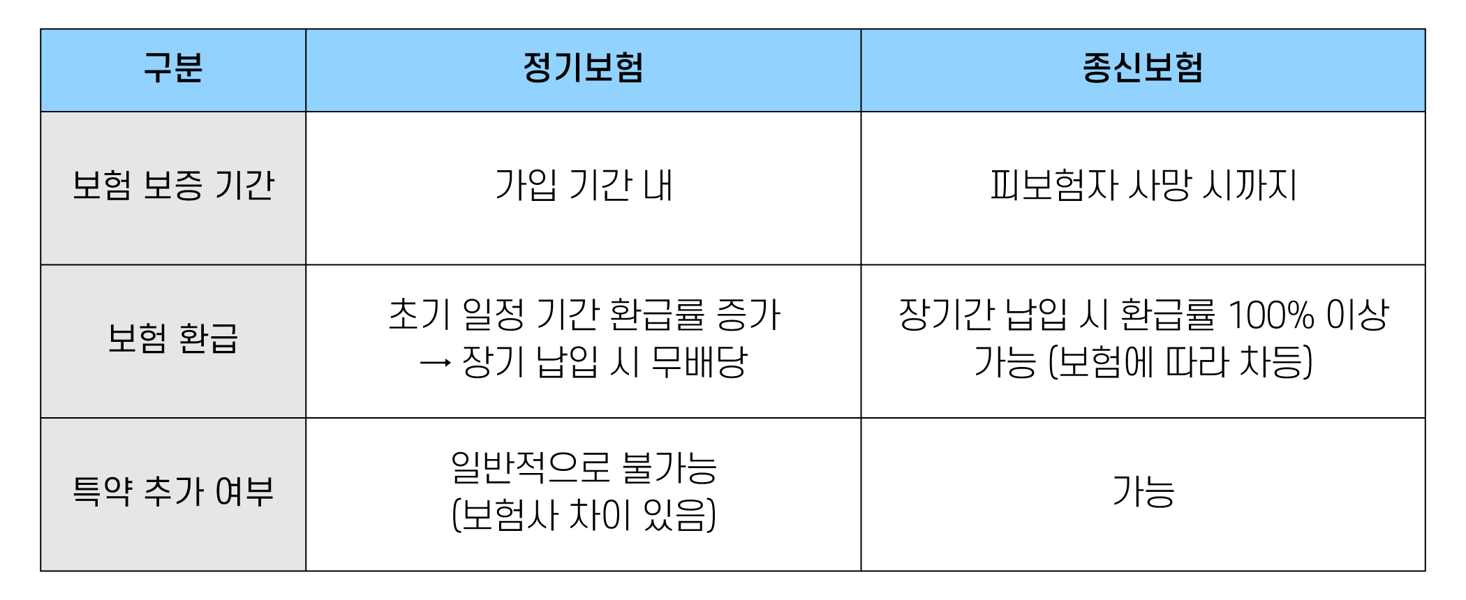 현재 대다수의 생명보험사에서 판매되는 생명보험 상품은 주로 정기보험입니다. 정기보험과 종신보험은 둘 다 사망 시 보험금을 받는 보장을 가지고 있지만, 주요한 차이점은 보험기간에 있습니다. 종신보험은 평생 동안 보장되는 반면, 정기보험은 특정 기간 동안 발생하는 사건에 대해 보장을 제공합니다. 이로 인해 종신보험의 보험료가 일반적으로 더 높은 편입니다
